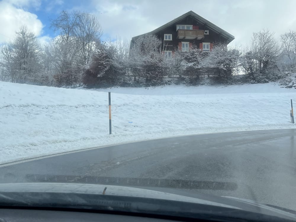 Wir fahren mit dem Auto nach Fideris. Nach dem Abzweiger von der Prättigauerstrasse wird es richtig winterlich. Die Strasse ist kaum gesalzen und wir müssen langsam den Berg hinauf fahren. Im Dorf angekommen werden wir auf den grossen kostenlosen Parkplatz für die Schlittler gewiesen.