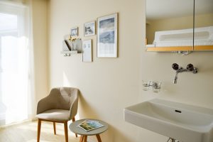 Eigentlich waren wir per E-Mail im Vorfeld mit einem Code für die Eingangstüre ausgestattet worden. Jetzt werden wir aber trotzdem persönlich begrüsst und sehr freundliche eingecheckt. Wir erhalten tolle Tipps für die Umgebung und sind dann bereits mit dem Lift in den zweiten Stock, wo sich unser Dreibettzimmer befindet.